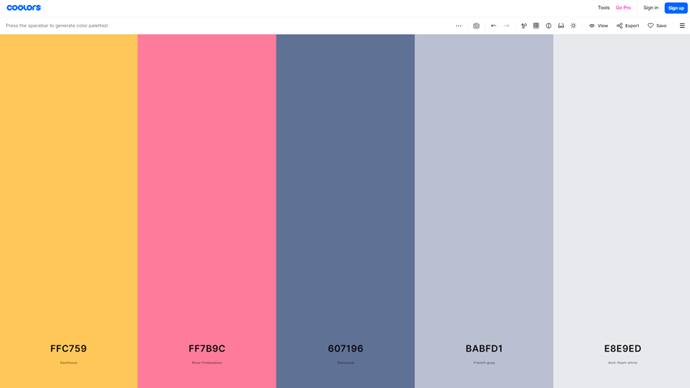 Como ayuda para seleccionar colores que puedan asociarse contigo y que combinen perfectamente, puedes ayudarte de herramientas gratuitas como Coolors, que te generará 5 colores complementarios en base a un color o colores primarios que desees, incluso podrá generarte una paleta de colores propia simplemente pulsando la barra espaciadora: